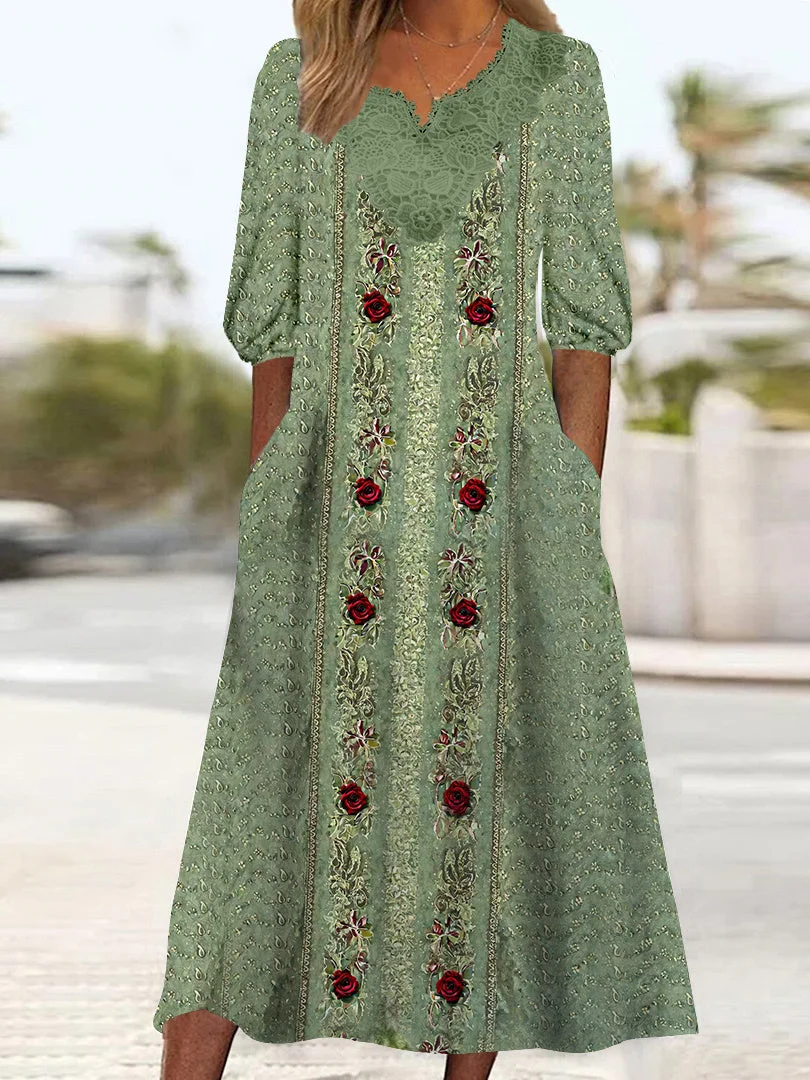 Women's 3/4 Sleeve V-neck Floral Printed Lace Stitching Midi Dress