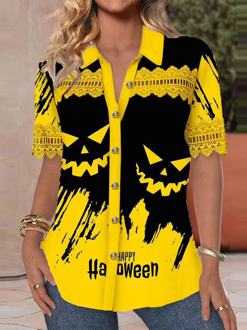 Women Short Sleeve V-neck Skull Printed Graphic Lace Hollow Stitching Button Tops