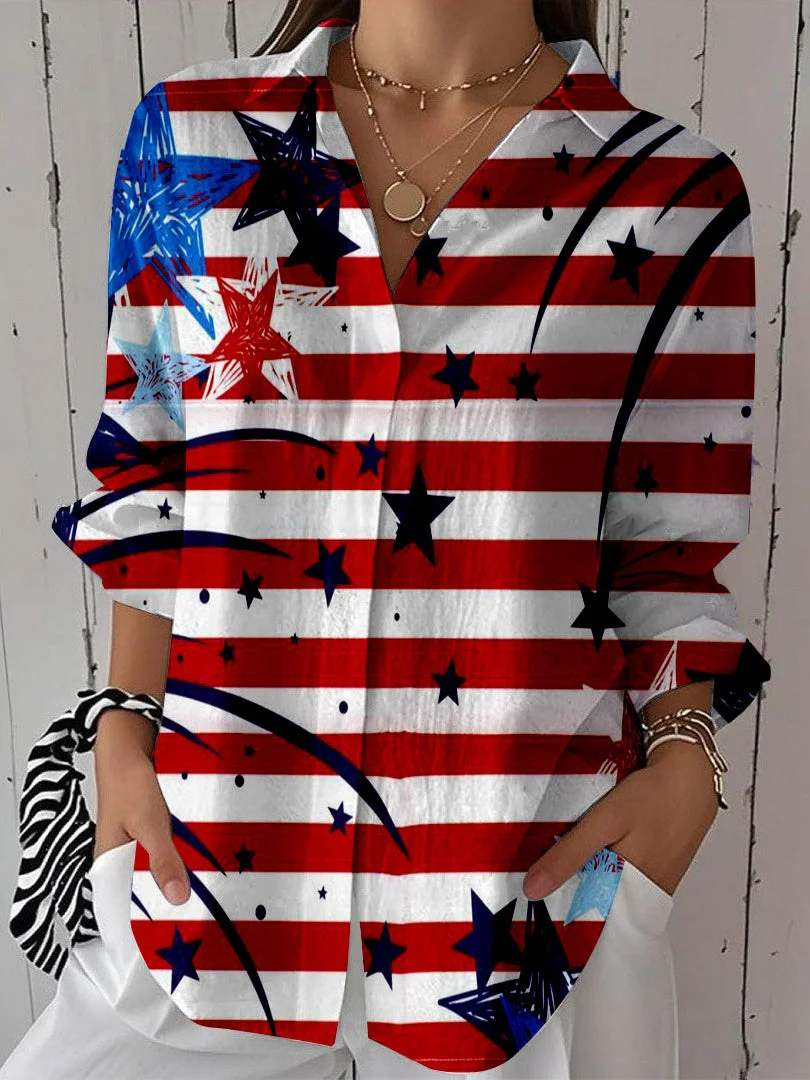 Women 3/4 Sleeve Shirt Collar National Flag Striped Printed Graphic Button Tops