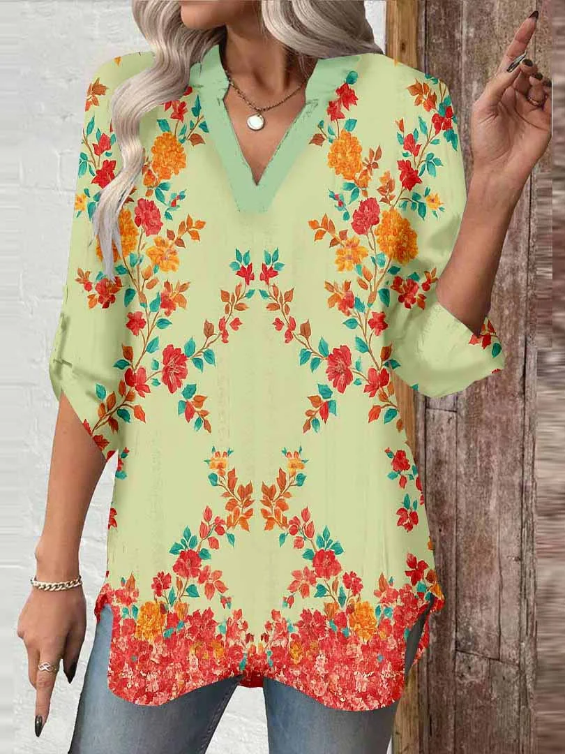 Women Floral, Green, Red DZGA0172 3/4 Sleeve V-neck Printed Graphic Button Tops
